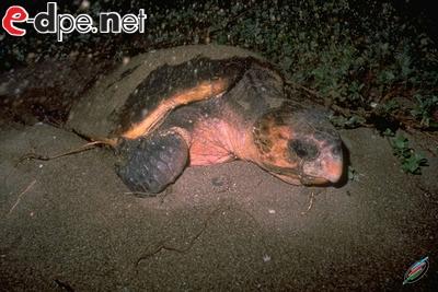 巣穴を掘るアカウミガメ